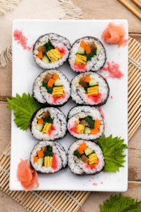 - Futomaki là một loại sushi cuộn lớn. Món sushi này thường được làm từ cơm trộn giấm, được cuộn cùng với nhiều loại nguyên liệu như tôm, trứng cá hồi, rau củ và các loại hải sản khác.